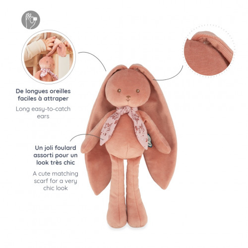 A cheeky bunny ready to wrap baby in soft cuddles! This tender and joyful Kaloo bunny puppet will become the companion for all of baby's adventures. From birth, little ones can easily grab it by its arms, legs, or long ears! You can tie your Lapinoo anywhere thanks to its big ears: to the stroller, the swing, or baby's activity arch! Exceptionally soft, this terracotta-colored bunny measures 35 cm. With its delicate little scarf matching the color of its body, it's ready to delight the whole family! An ideal birth gift to become baby's cuddly toy and add a touch of trendy color to their room. Presented in a pretty box, this bunny plush toy will quickly become baby's favorite playmate. For a kinder gesture towards the planet, our Lapinoo puppets contain at least 97% recycled materials and padding.
