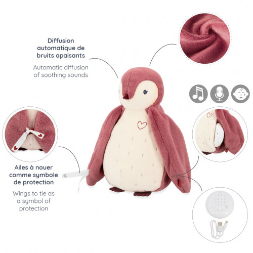 Apaisez bébé grâce à cette peluche à bruits blancs avec enregistreur vocal ! Cette peluche manchot est adaptée aux tout-petits dès la naissance et permet de diffuser une variété de sons apaisants, mais aussi d'enregistrer votre message personnalisé, pour rassurer votre enfant à tout instant. Toute douce, la peluche rose est simple d'utilisation : grâce au boitier accessible par une ouverture sur le côté, vous pouvez sélectionner 4 bruits blancs (battements de cœur, pluie, vent, sons sous la mer) et enregistrer votre message, comptine, berceuse chantée ... Le fonctionnement de l'enregistreur vocal est détaillé dans la notice fournie. Grâce à son mode "détection des pleurs", la peluche à bruits blancs Kaloo sera un véritable atout au sommeil de bébé. Rechargeable par câble USB (inclus), cette peluche sonore est pratique et dispose d'une autonomie de 23 heures ! Vous pouvez également régler un minuteur de 15 minutes, 30 minutes ou 1 heure, en fonction de vos besoins. Cet adorable manchot rose sera le compagnon de repos et de jeu de bébé. Sa jolie frimousse et son ventre rebondi nous font craquer ! Mesurant 25 cm de hauteur, la peluche sonore est composée de velours côtelé et de fourrure synthétique (polyester) et est lavable en machine après retrait du boitier. Le rembourrage est en polyester recyclé. Les moments de séparation, comme le coucher, peuvent être déplaisants et source d'angoisse pour bébé. Afin de mieux exprimer le lien si spécial qui l'unit à son parent et de le rassurer, cette peluche à bruits blancs est décorée d'un cœur rouge et ses ailes peuvent être nouées à l'aide d'un ruban orné d'un joli cœur. Cadeau de naissance idéale, cette peluche manchot est présentée dans un joli coffret personnalisable, pour un présent empreint de toute votre affection. Cette peluche à bruits blancs manchot rose fait partie de notre gamme Complices : une collection de peluches et doudous exprimant amour et réconfort, pour illustrer le lien qui unit un bébé à ses parents et ainsi l'accompagner en douceur dans les premières séparations.